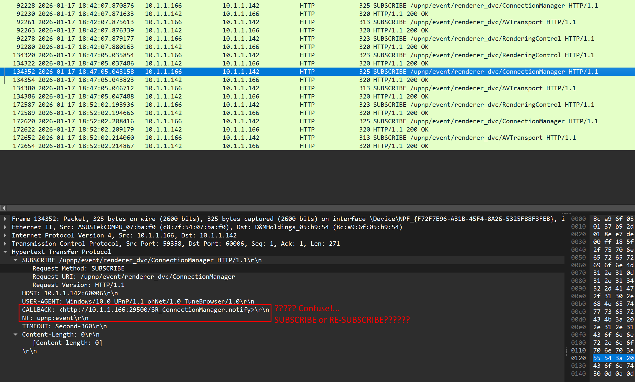 I used Wireshark to analyze TuneBrowser’s UPnP event behavior with different DMR devices.