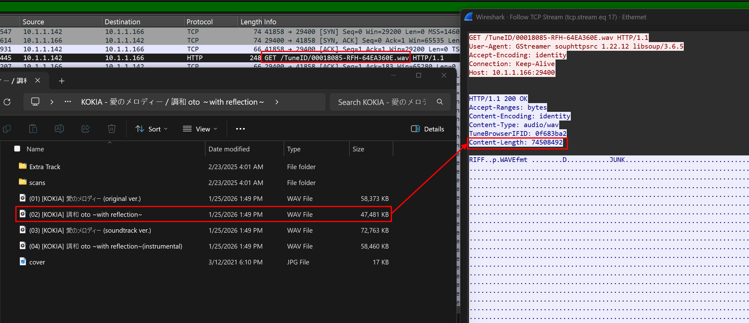 After properly isolating the initial URI, I can confirm the Content-Length provided by TuneBrowser was entirely correct.I apologize for the confusion—sometimes with Wireshark’s rapid packet updates and multi-threaded track management, it’s easy to mix up request contexts.